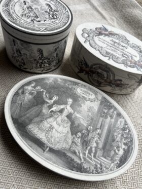 ANRY&Co.の佐久間靖子さんによるアンティークモチーフデザインを用いて箱に仕上げます。 アンティークの印刷物を修正、修復し佐久間先生が新たにデザインし直した図案のペーパーを使用。カルトナージュの要領で箱に貼り付けてい …